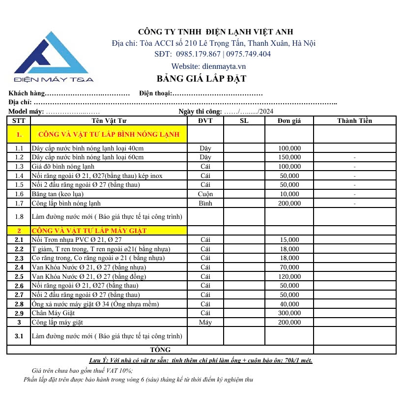 Dưới đây chúng tôi xin gửi đến quý khách hàng bảng báo giá lắp đặt Bình nóng lạnh áp dụng trong năm 2024.