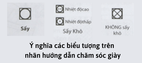 Nếu bạn thấy một hình vuông có chữ X bên trong thì giày của bạn không thể làm khô bằng máy sấy quần áo. Nếu bạn thấy biểu tượng hình tròn trong hình vuông tức là giày có thể sấy khô ở nhiệt độ thấp.