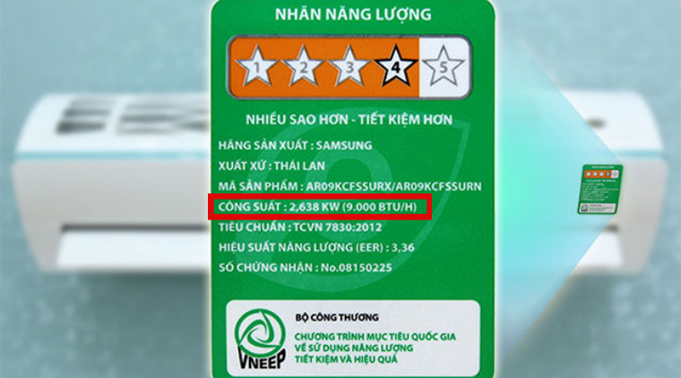 Từ phép tính trên ta có thể thấy công suất làm lạnh định mức của điều hòa có công suất 9000 BTU là 2637W.