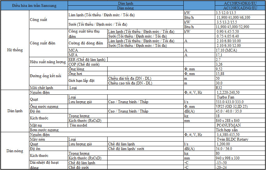 Điều hòa âm trần Samsung AC120RN4DKG/EU-AC120RXADNG/EU 2 chiều 42.000BTU sử dụng điện 3 pha . Máy được nhập khẩu tại Trung Quốc và được bảo hành chính hãng 24 tháng . Công suất 42.000BTU , Sản phẩm phù hợp lắp đặt cho các phòng có diện tích nhỏ hơn 75m2 .