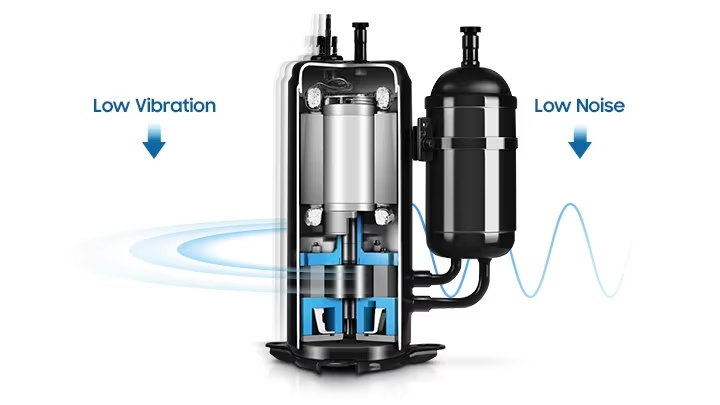 Dàn nóng điều hòa multi Samsung 2 chiều AJ125TXJ5KH/EA với máy nén Twin Rotary BLDC mang lại hiệu quả vận hành cao và đáng tin cậy. Khoang nén đôi với trọng lượng cân bằng tạo ra độ rung cực thấp, góp phần giúp máy chạy mượt mà và yên tĩnh hơn. Việc sử dụng các bộ phận chuyển động chất lượng cao, chẳng hạn như vòng bi chắc chắn, con lăn và van cao cấp cũng đảm bảo độ ổn định và độ bền tốt nhất.