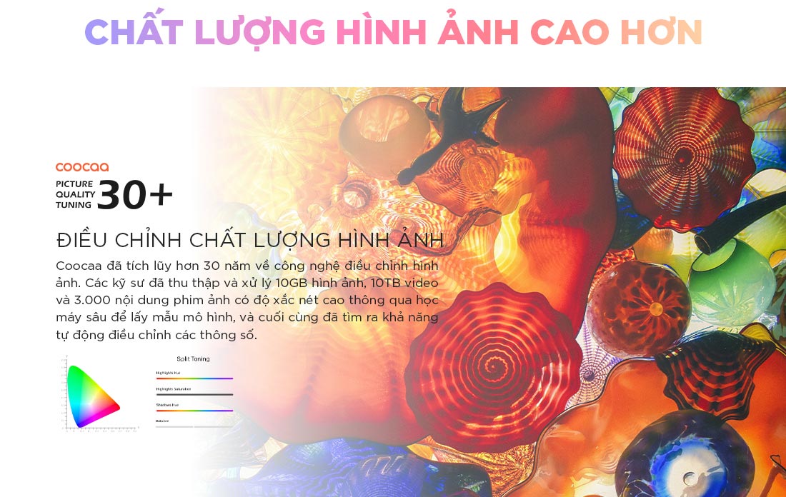 Với hơn 30 năm kinh nghiệm, Coocaa 50S3U Pro có thể đem lại chất lượng hình ảnh vô cùng sống động và đầy sắc màu. Việc tính chỉnh được các kỹ sư của tivi Coocaa phân tích từ 10TB video, 10GB hình ảnh và 7 mô hình điều chỉnh được thu thập từ những nguồn dữ liệu chất lượng nhất. Coocaa có mọi thứ bạn muốn!