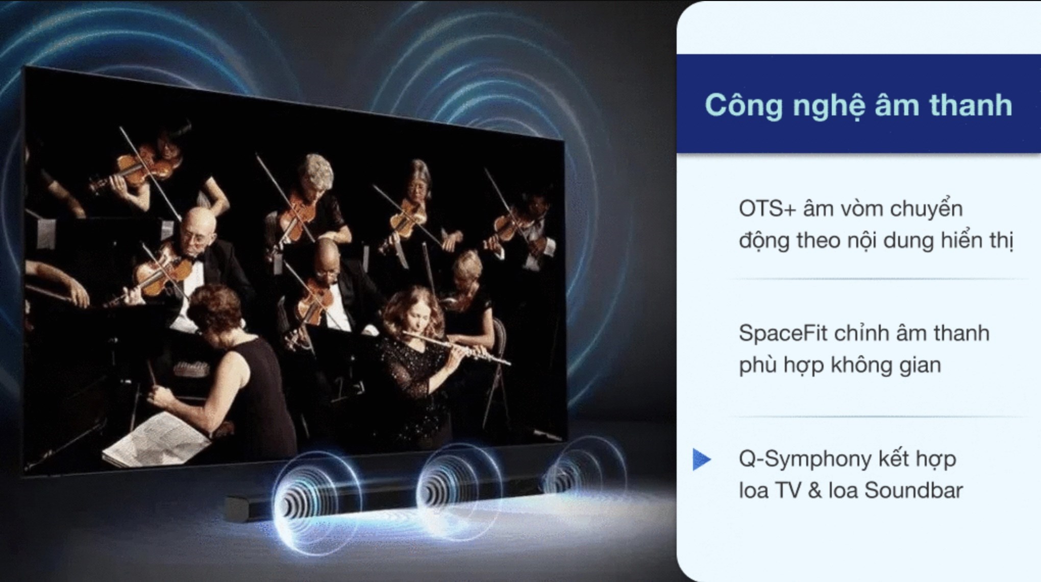 | Công nghệ âm thanh: Âm thanh phù hợp không gian SpaceFit Sound, Khuếch đại âm thoại chủ động AVA, Q-Symphony kết hợp loa tivi với loa thanh |