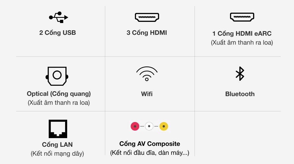 | Cổng xuất âm thanh: Cổng Optical (Digital Audio Out), 1 cổng eARC (ARC) |