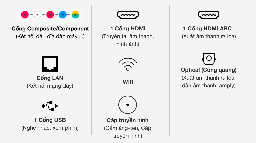 | Cổng xuất âm thanh: Cổng Optical (Digital Audio Out), 1 cổng eARC (ARC) |